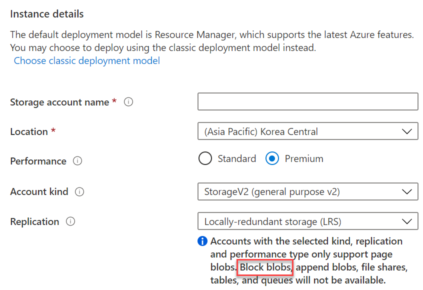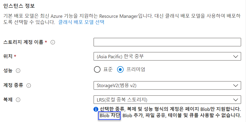 Azure [스토리지 계정 만들기] 블레이드에서 [성능] 계층을 "프리미엄"으로 지정했을 때 아래 주의 사항으로 표시되는 내용 중 "Blob 차단" (빨간색 상자) 은 잘못된 번역이다. "블록 Blob"으로 고쳐야 한다.