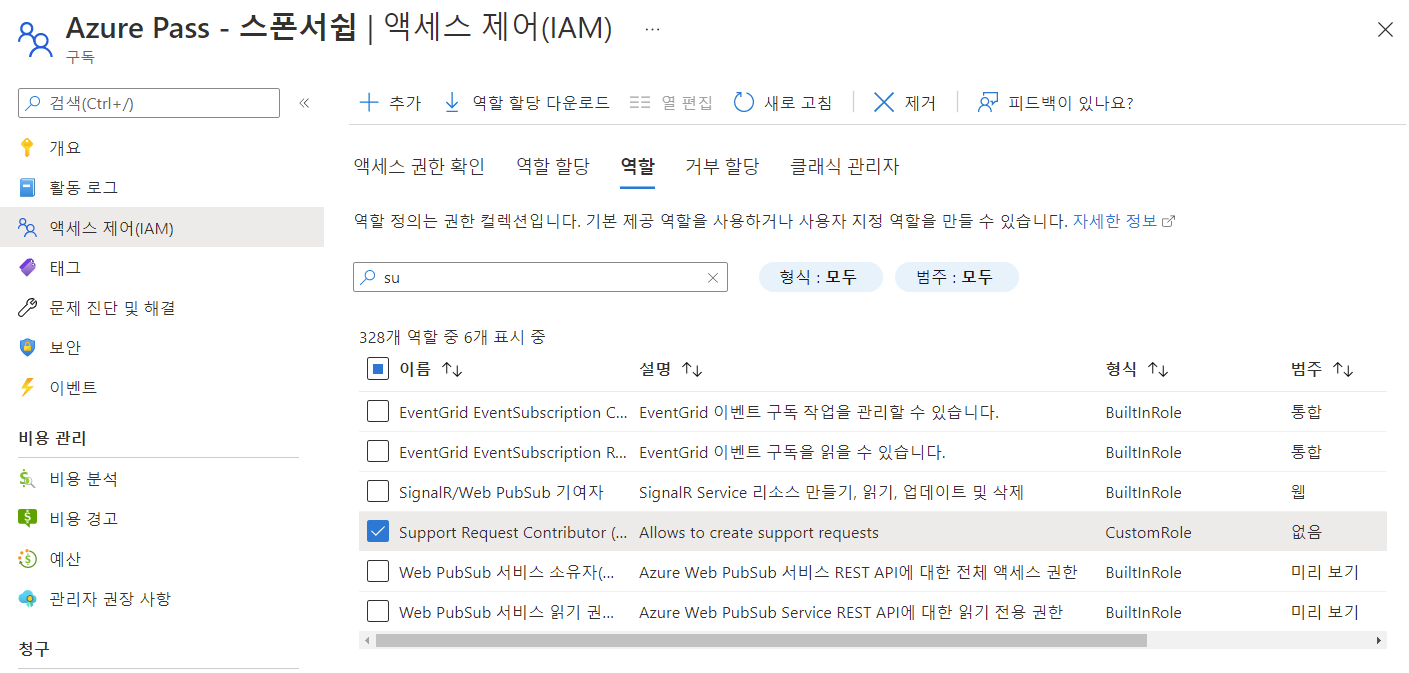 내용을 자세히 살펴보고나서 동일한 이름의 사용자 지정 역할 정의(여기서는 Support Requests Contributor)가 있다고 결론을 내렸습니다.
