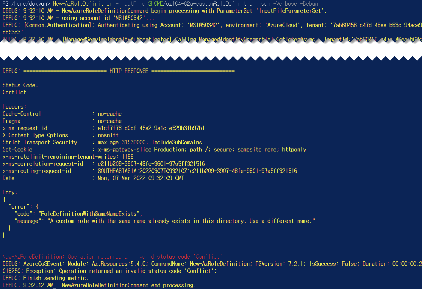찾은 동일한 이름의 사용자 지정 역할 정의를 삭제한 후, Azure PowerShell 명령을 다시 실행하니,