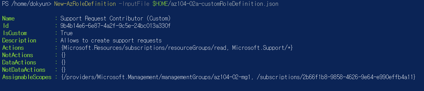 드디어 아무 문제없이 실행되고 현재 활성 구독에 사용자 지정 역할도 만들어 졌습니다.