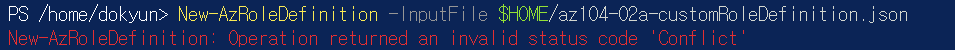 Azure PowerShell의 New-AzRoleDefinition cmdlet을 사용해 이 JSON 파일을 적용했을 때, 다음 그림에 표시된 에러를 만났습니다.