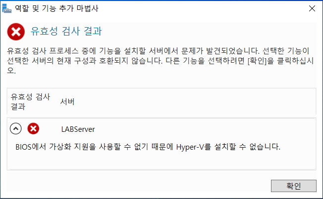 중첩 가상화를 지원하지 않는 VM 크기를 사용한 경우, Hyper-V 역할 설치에서 다음과 같은 실패 화면을 만날 것이다.