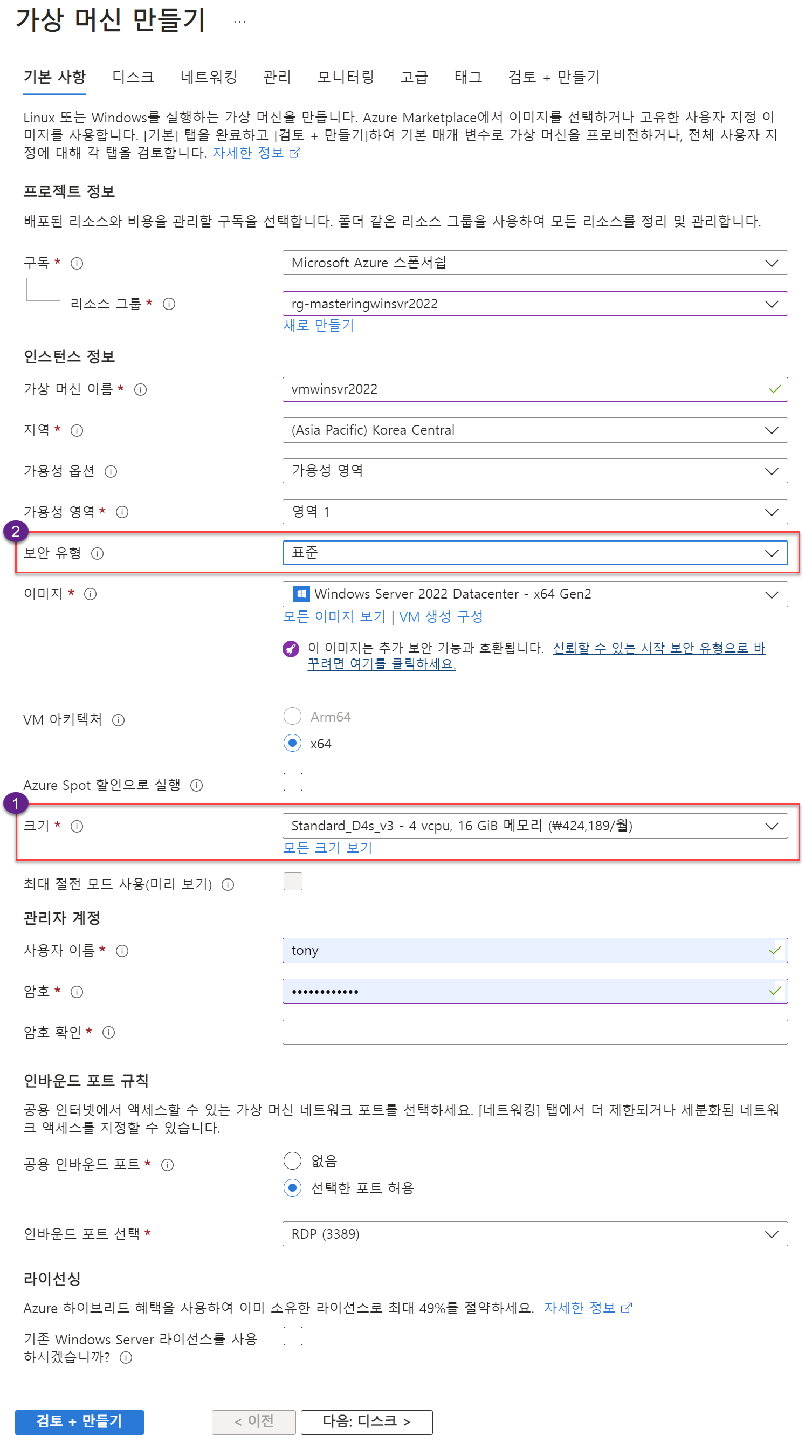 2. VM 프로비전을 위한 [기본 사항] 입력에서 [보안 유형]을 "표준"으로 선택한다.