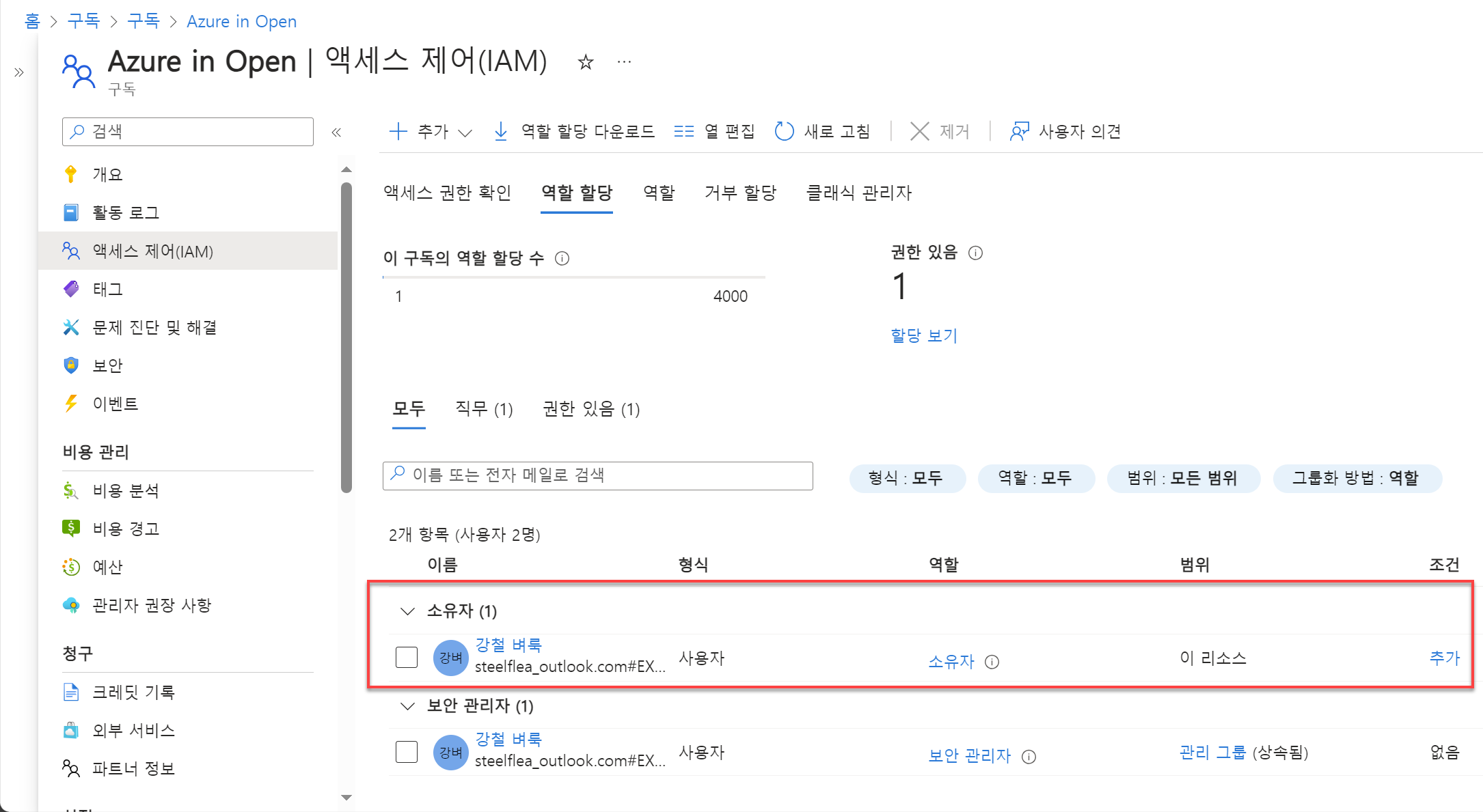 11. 다시 [액세스 제어] 블레이드에서 방금 추가한 구성원이 소유자 역할로 표시되는지 확인 합니다.