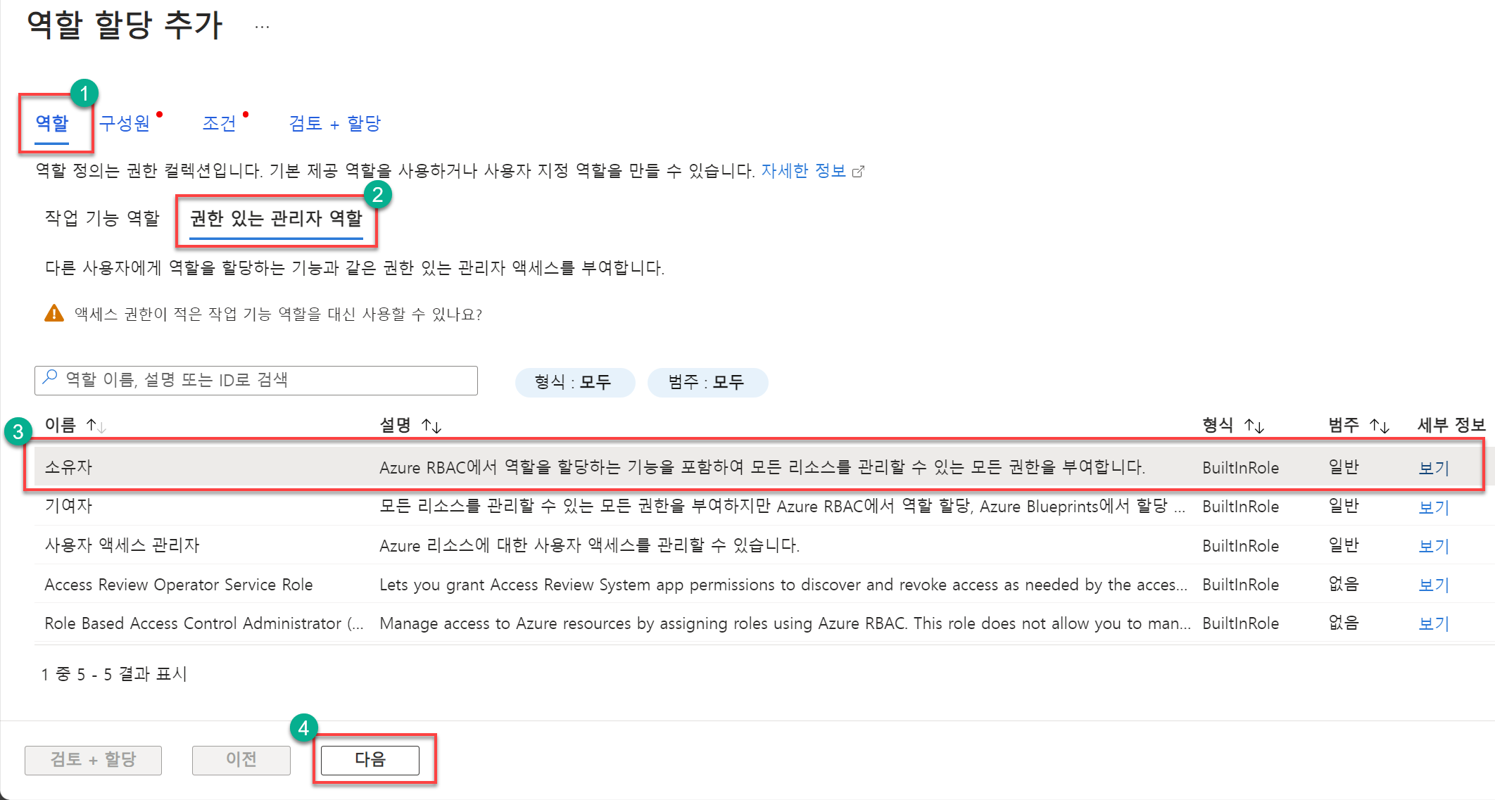 5. [권한 있는 관리자 역할] 탭 아래의 역할 목록에서 [소유자] 항목을 선택한 후 [다음] 버튼을 클릭합니다.