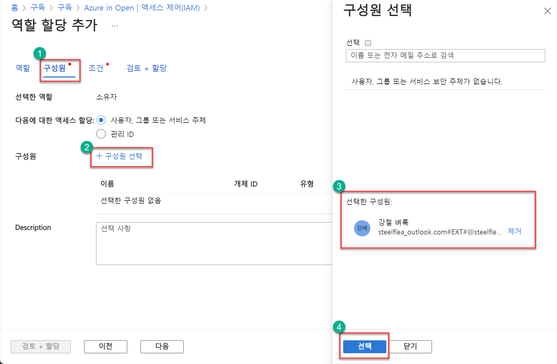 7. [구성원 선택] 블레이드에서 역할을 할당할 구성원을 선택한 후, [선택] 버튼을 클릭합니다.