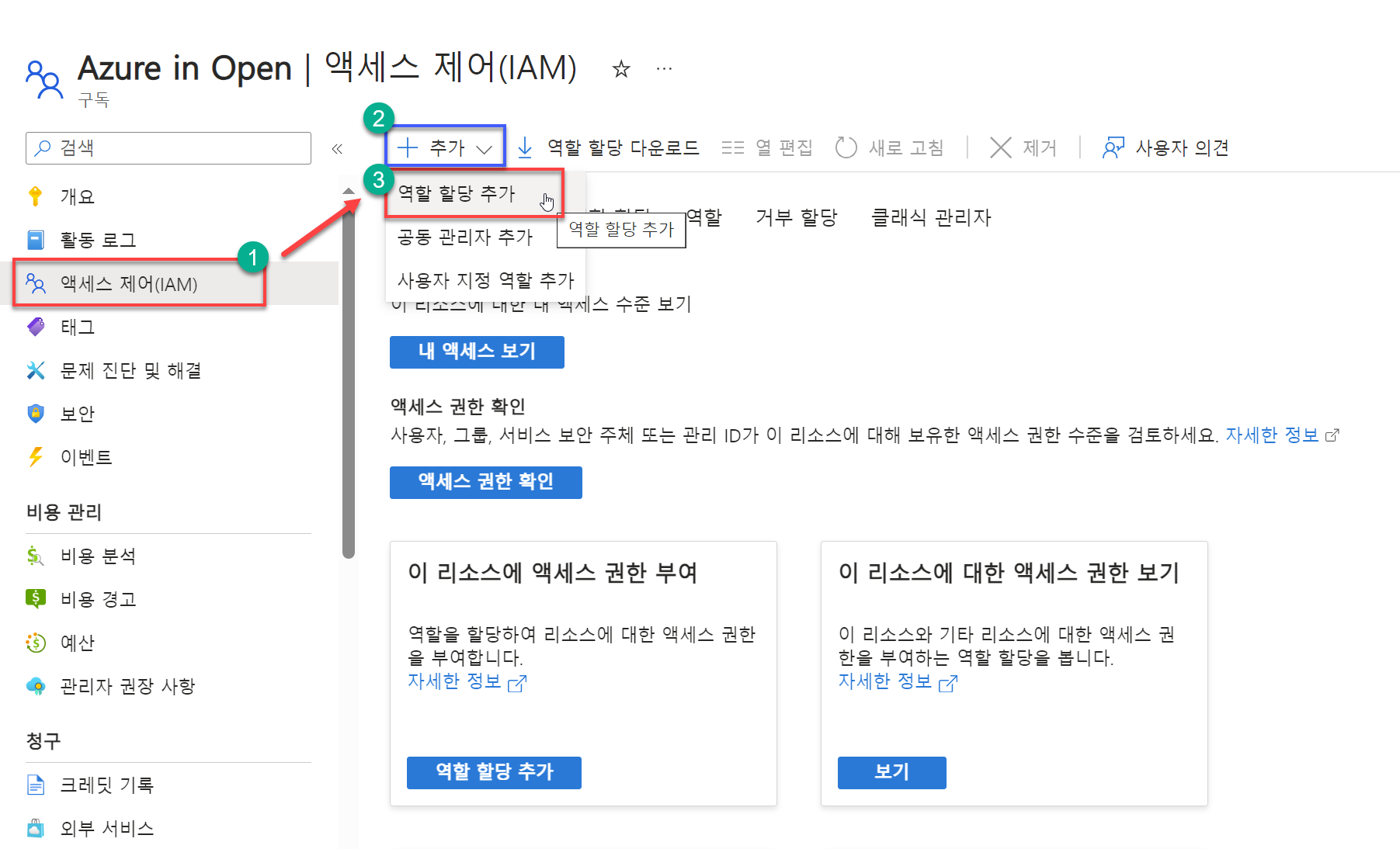 3. [액세스 제어(IAM)] 블레이드의 명령 모음에서 [+추가] 드롭 버튼을 클릭하고 [역할 할당 추가] 메뉴를 선택한다.
