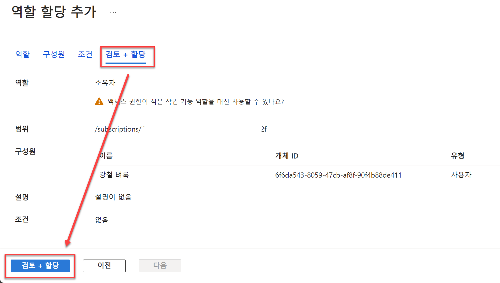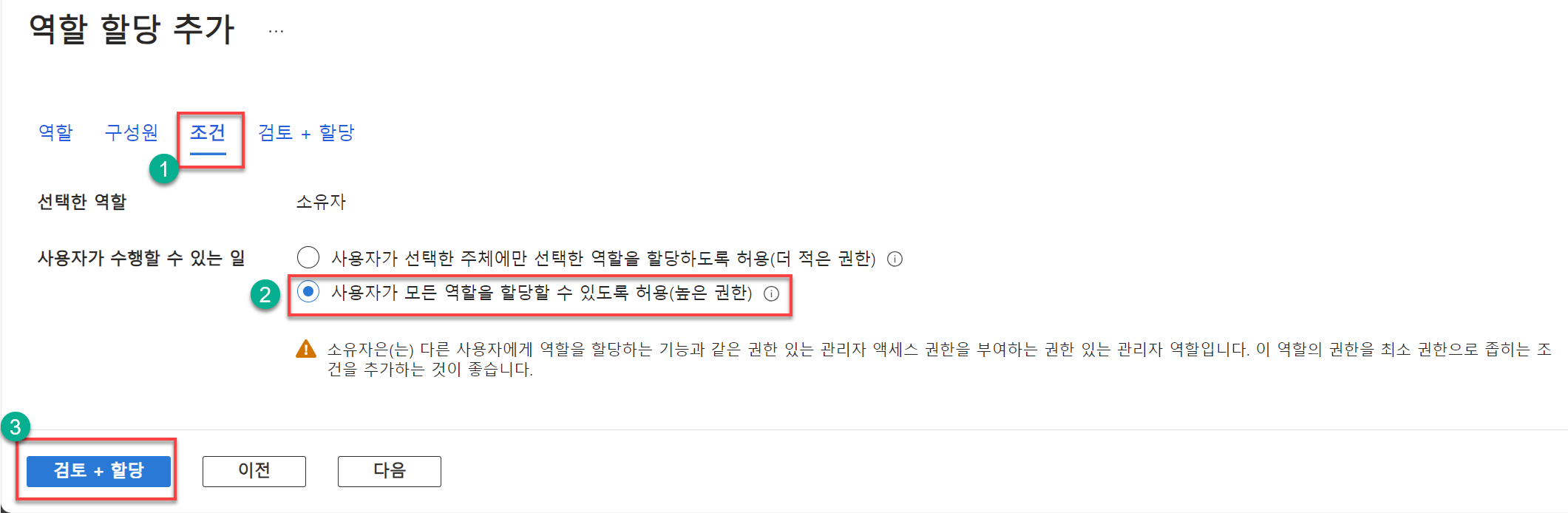9. [조건] 탭 메뉴에서 [사용자가 수행할 수 있는 일] 항목에서 '사용자가 모든 역할을 할당할 수 있도록 허용(높은 권한)'을 선택하고 [검토+할당] 버튼을 클릭합니다.