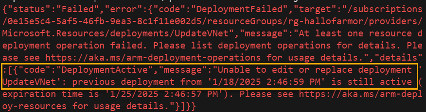 이 외에도 내 구독이나 리소스 그룹에서 실제 배포중인 상태라면 배포 완료나 실패를 기다리거나, 진행 중인 다른 배포를 취소하고 다시 배포를 시도할 수 있다.