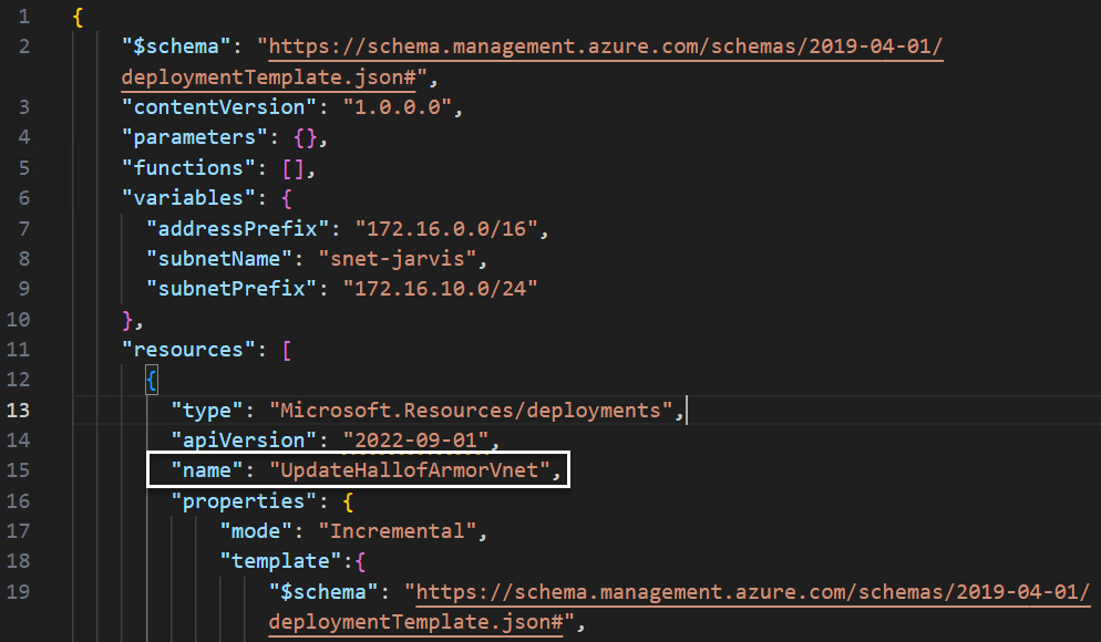 기존 가상 네트워크를 업데이트하는 update-vnet.json 이라는 ARM 템플릿을 작성했다.
