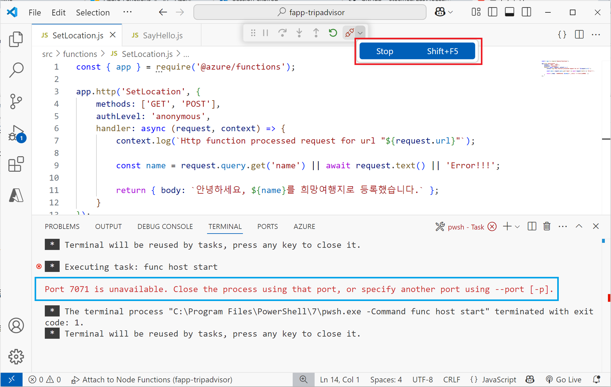 이후, 코드를 수정한 후 다시 로컬 펑션을 실행하면 7071 포트가 사용되고 있어 프로세스를 종료하거나 다른 포트를 사용하라는 메시지를 보게됩니다. (다음 그림의 파란 상자)