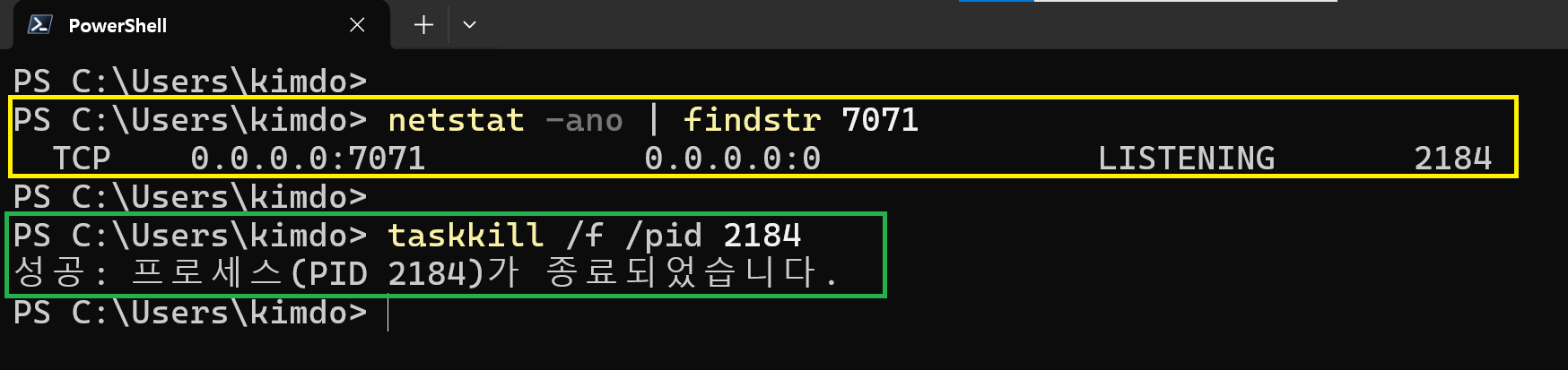 다음 명령으로 7071 포트를 사용중인 프로세스를 종료합니다. (다음 그림의 녹색 상자)