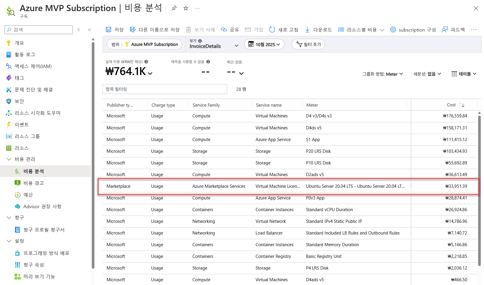 다시, 구독의 [비용 관리] 섹션의 [비용 분석] 메뉴에서 청구된 월의 <청구서 세부 정보> 항목을 선택해 해당 부분을 자세히 확인했더니, 다음 그림의 빨간 상자에 보이는 Ubuntu Server 20.04 LTS의 라이선스 비용이었습니다.