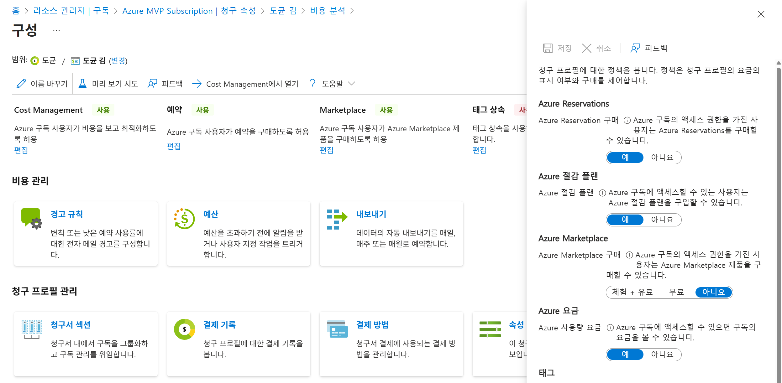 1. [자신의 구독] > [청구 속성] > [청구 프로필 이름] > [비용 분석] > [billing profile 구성]을 클릭한다.