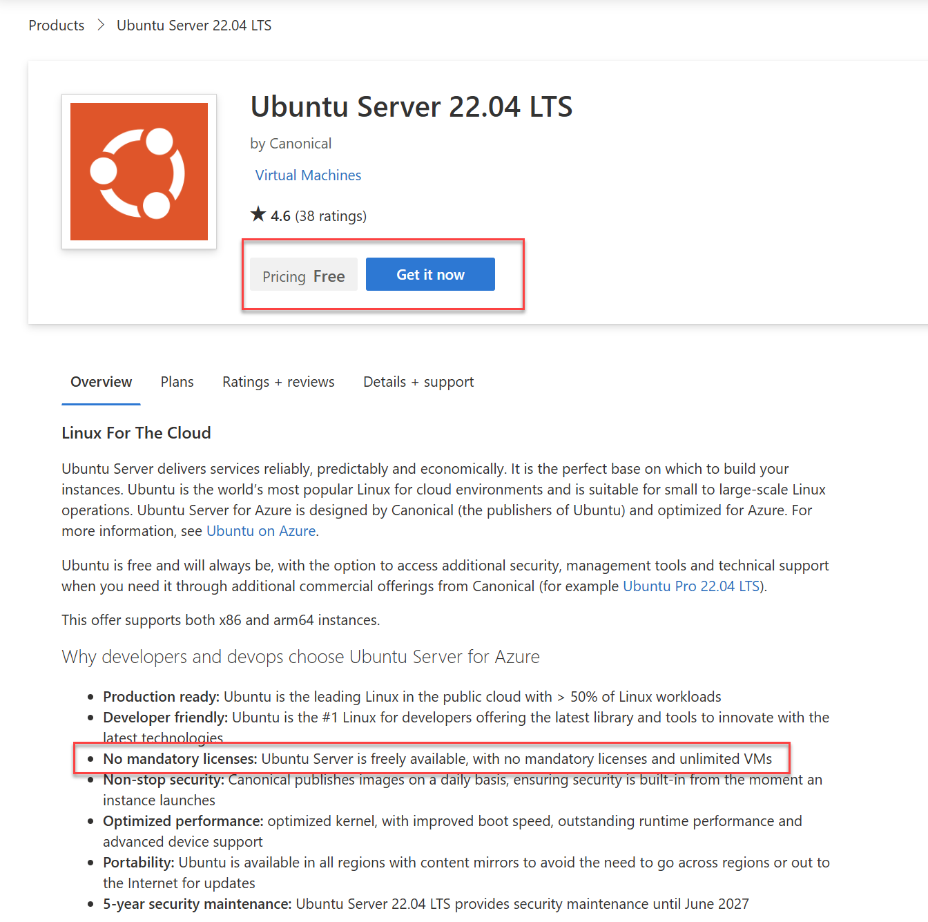 최근에는 Ubuntu Server 22.04 LTS가 많이 사용되는데, Azure 마켓플레이스에서 Ubuntu Server 22.04 LTS는 다음 그림처럼 라이선스가 무료로 표시되어 있습니다.