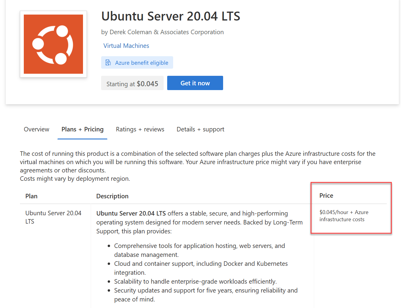 다음 그림에서 보인 것처럼 Ubuntu Server 20.04 LTS는 공급자가 달랐고, 유료 라이선스 정책으로 시간당 0.045$를 부과하고 있었기에, 이 부분은 마이크로소프트의 Azure 크레딧으로 차감할 수 없었던 것입니다.