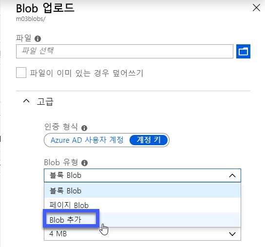 The "Blob 추가" shown by the blue rectangle should be modified to "추가 Blob" or "덧붙이기 Blob" because it is an incorrect translation.