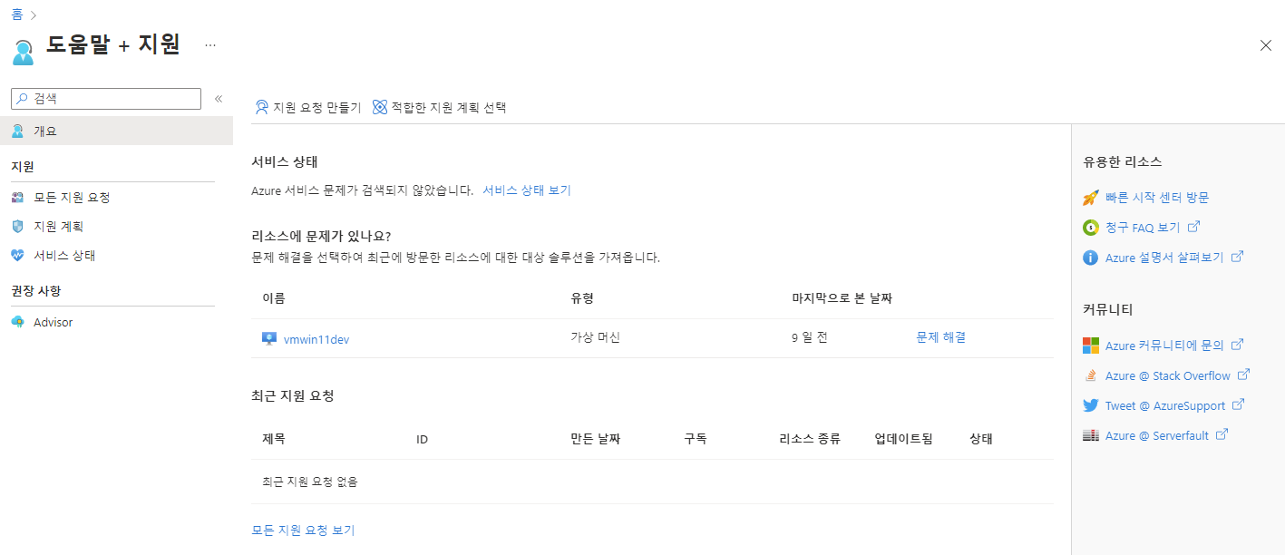 Azure Portal의 [도움말 + 지원] 서비스를 이용해보기로 했다.