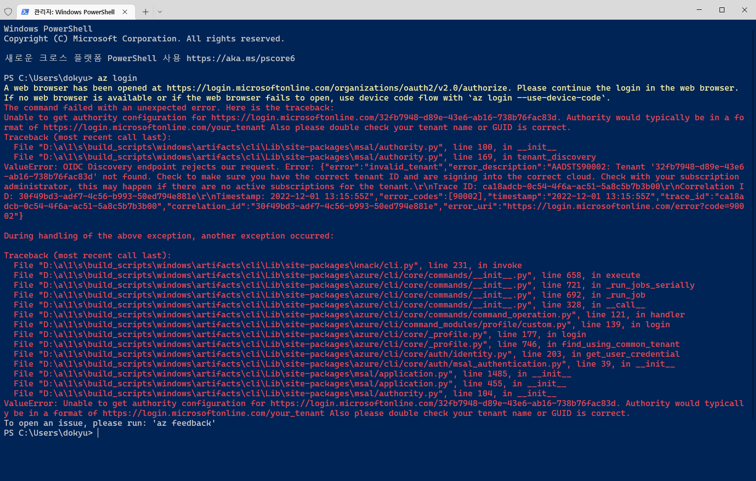 Azure CLI 또는 Azure PowerShell을 사용해 로그인을 하면, 특정 테넌트를 찾을 수 없다는 에러를 뿌린다.