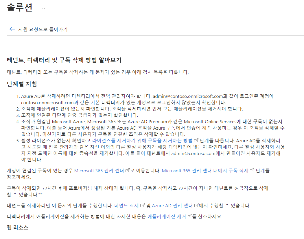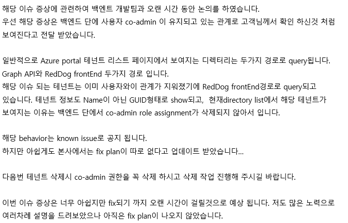 "유령 테넌트 삭제 불가" 문제에 대한 마이크로소프트 기술 지원 결과.